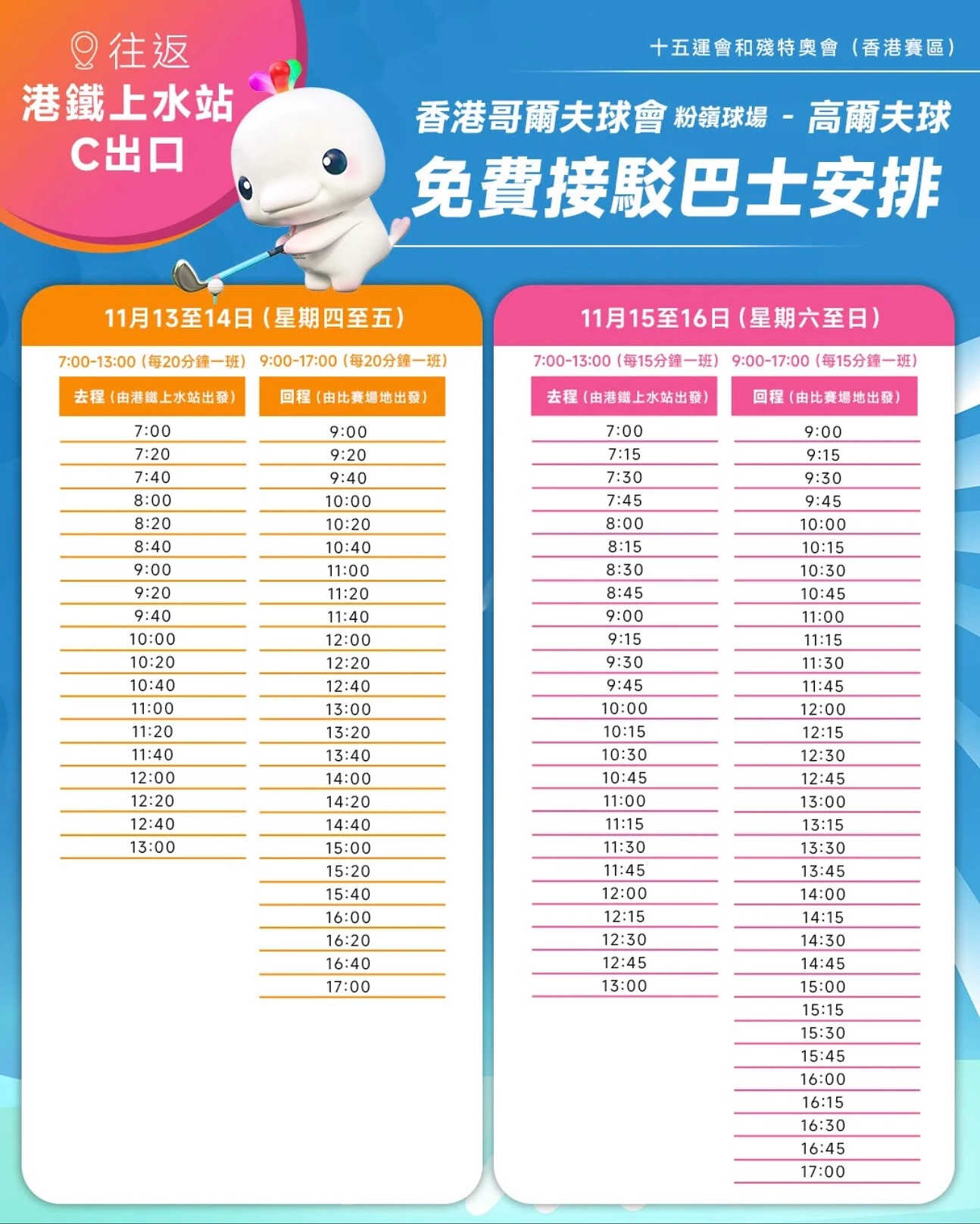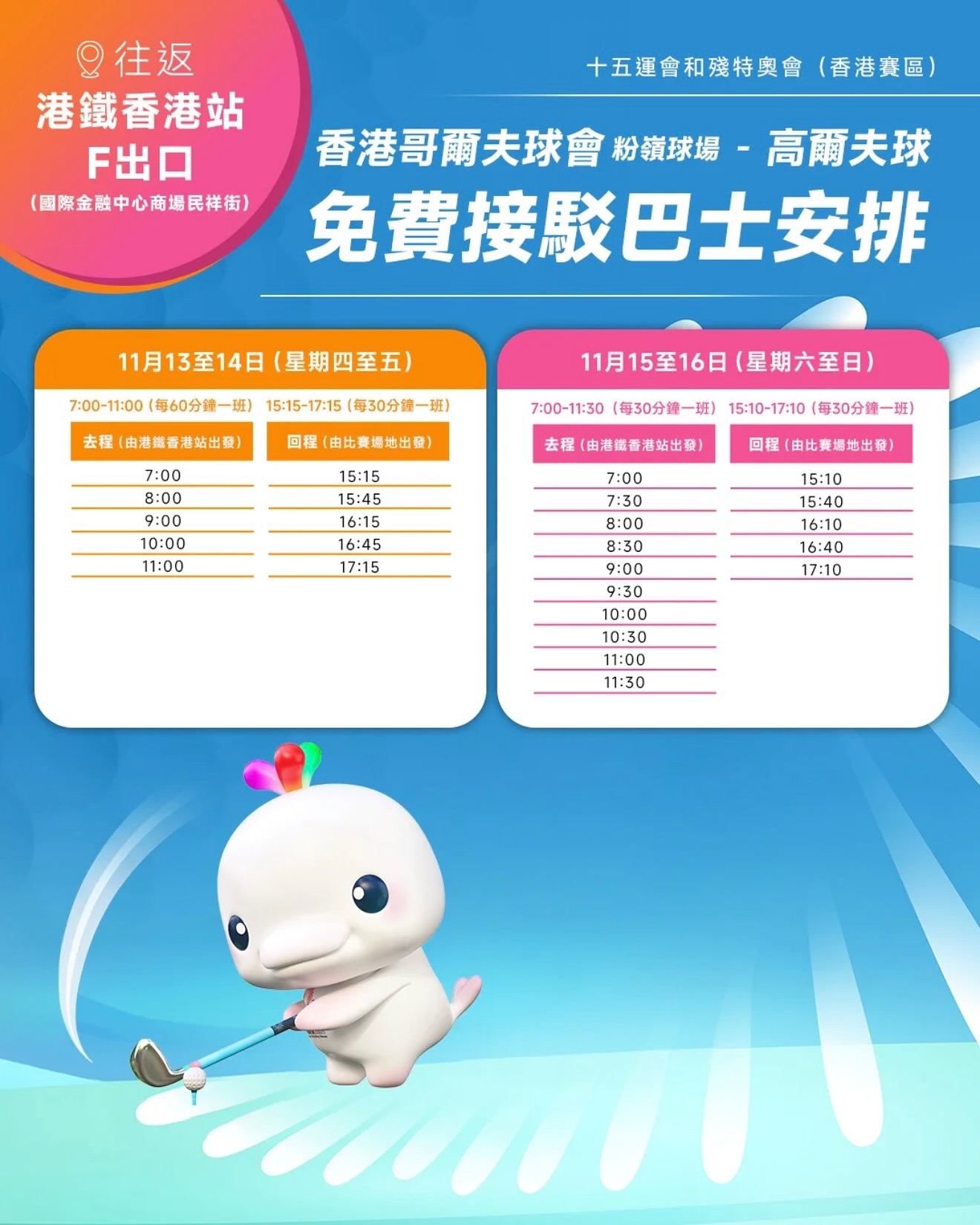 為方便廣大市民親赴賽場觀戰,大會特設免費接駁巴士,往返港島、九龍及新界的主要港鐵站與粉嶺球場之間。此外,比賽場地內亦設有「賽事觀眾村」,匯聚多個互動攤位與娛樂節目,致力推廣高爾夫球運動,豐富觀賽體驗。賽事將一連四天激烈進行,誠邀各位球迷踴躍到場,為香港隊呐喊助威,共同見證這場高水準的高爾夫球盛事。門票現已於官方售票網站(https://ticket.baygames.cn/#/home)公開發售,星期五門票定為人民幣50元,星期六為人民幣100元,而星期日決賽日則為人民幣200元。現場另設即場售票處,其位置鄰近安檢區。所有即場門票將根據固定匯率,將人民幣定價換算為港幣售價。歡迎及早購票親身到場支持。